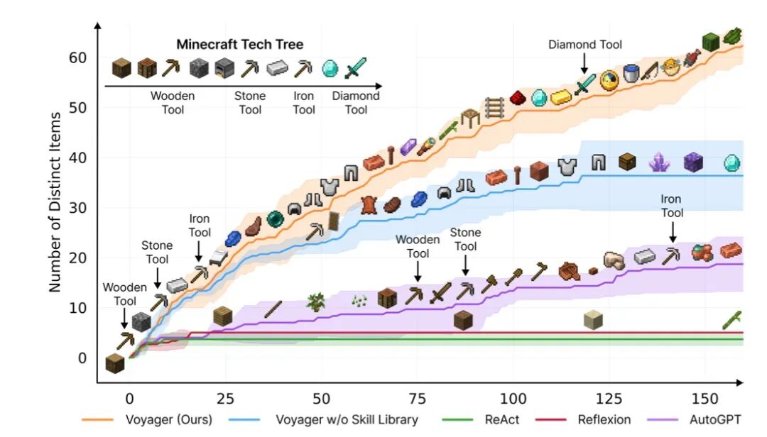Voyager 通过黑盒查询与 GPT-4 进行交互,从而避免了模型参数微调的需要。Voyager 所开发的技能具有时间扩展性、可解释性和组合性,能迅速增强代理的能力,减少灾难性遗忘。从经验上看,Voyager表现出很强的在情境中终身学习的能力,在玩 Minecraft 时表现出非凡的熟练程度。与之前的 SOTA 相比,它获得的独特物品数量增加了 3.3 倍,旅行距离延长了 2.3 倍,解锁关键技术树里程碑的速度提高了 15.3 倍。Voyager 能够在新的 Minecraft 世界中利用学习到的技能库从头开始解决新任务,而其他技术则很难做到这一点。