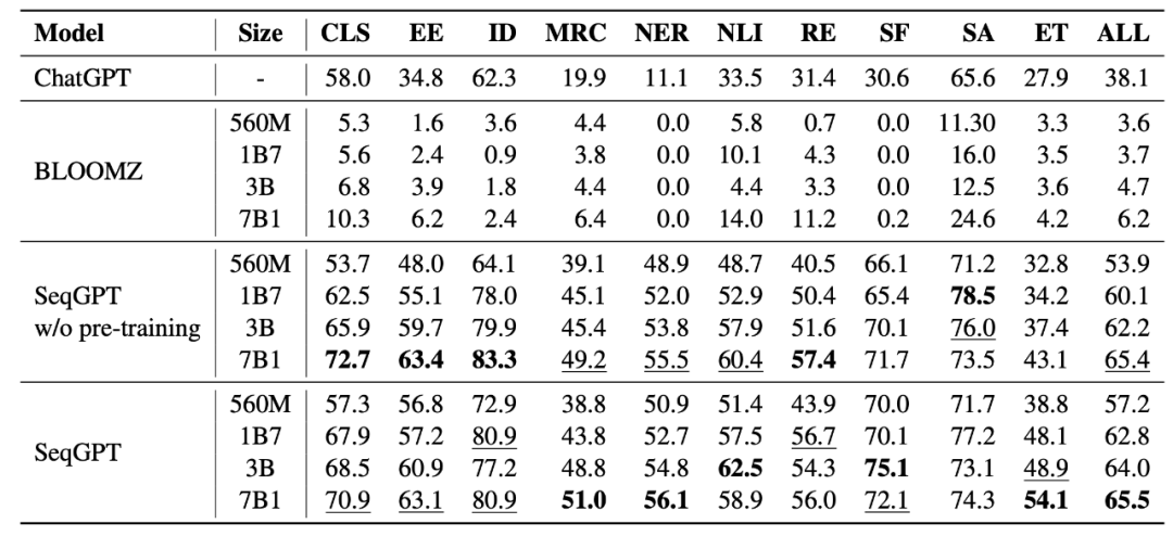 上表中比较了SeqGPT家族和基线模型的测试集性能。我们有以下发现: