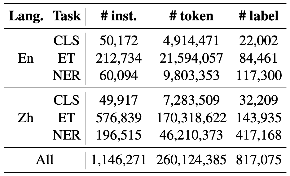 相关研究证明,丰富数据多样性有利于提升模型的泛化能力。因此,我们构建了一个大规模的预训练(PT)数据集,包含来自多个领域(包括维基百科、新闻和社交媒体等)极其多样化的标签集的数据。我们主要选择了三个任务:分类(CLS)、实体分类(ET)和实体识别(NER)。我们通过调用ChatGPT为每个样本获得伪标签。最终,PT数据集包含1,146,271个实例和817,075个不同的标签。下表列出了详细的统计信息。