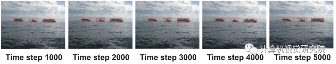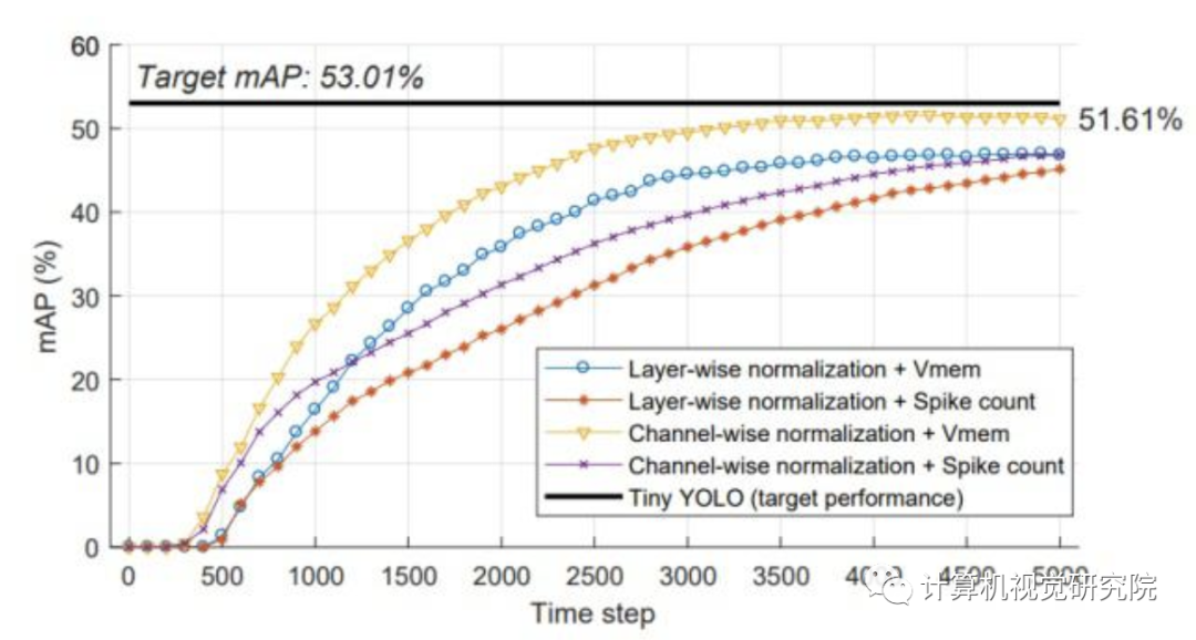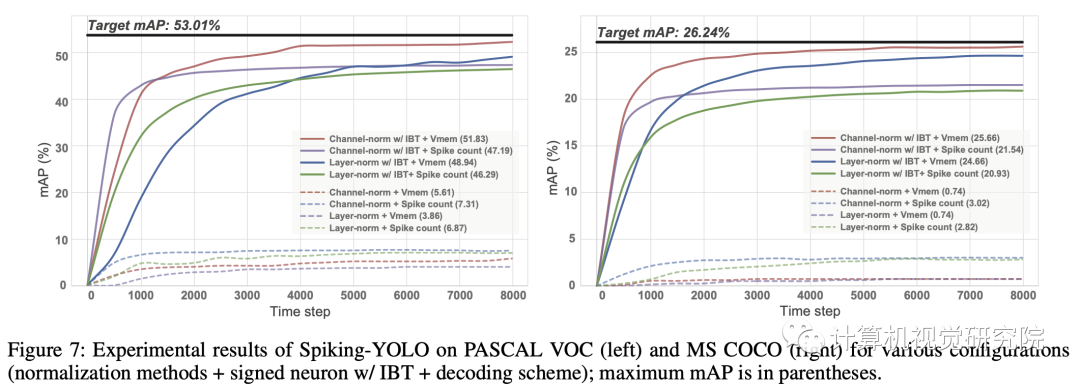 此外,逐层正则化的mAP仅仅46.98%,而通道正则化优势明显,收敛速度也更快。如果不使用本文提出的这两种方法,Spiking-YOLO无法检测目标,如果仅仅使用有符号神经元的话,mAP仅仅7.3%,这表明有符号神经元可以补偿leakyReLU的不足项,并且在解决深度SNN中这种高数值精度问题中起着关键作用。