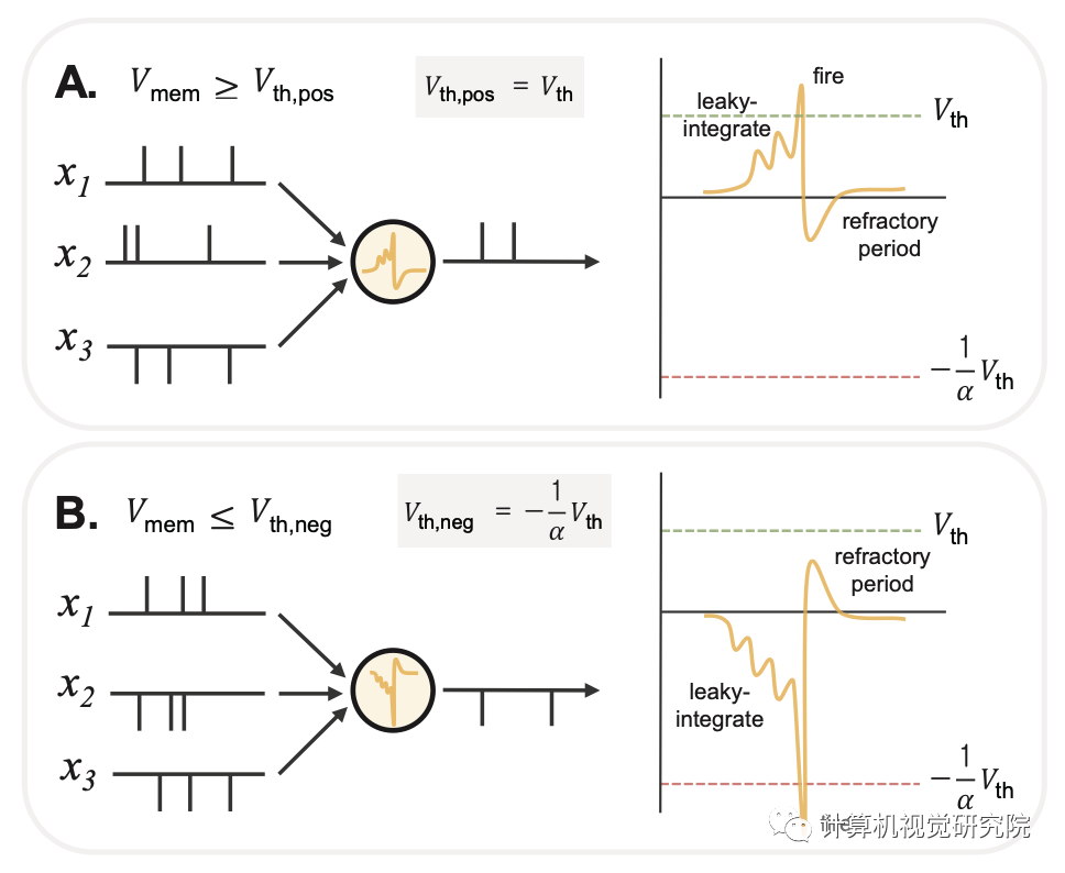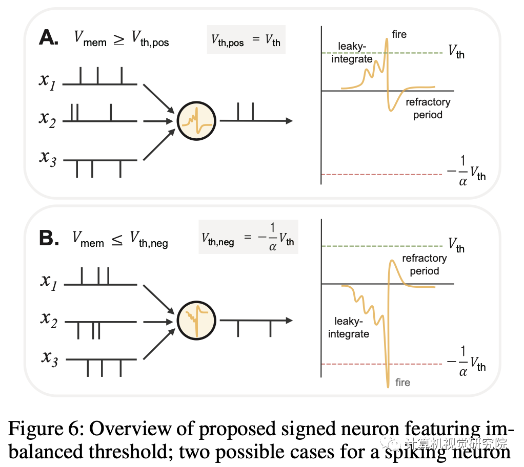 引入了一种具有不平衡阈值(即IBT)的带符号神经元,它不仅可以对正负激活进行解释,还可以对leakyReLU负激活值区域的渗漏项进行补偿。如下图所示,作者增加了另外一个Vth负责对负激活响应。