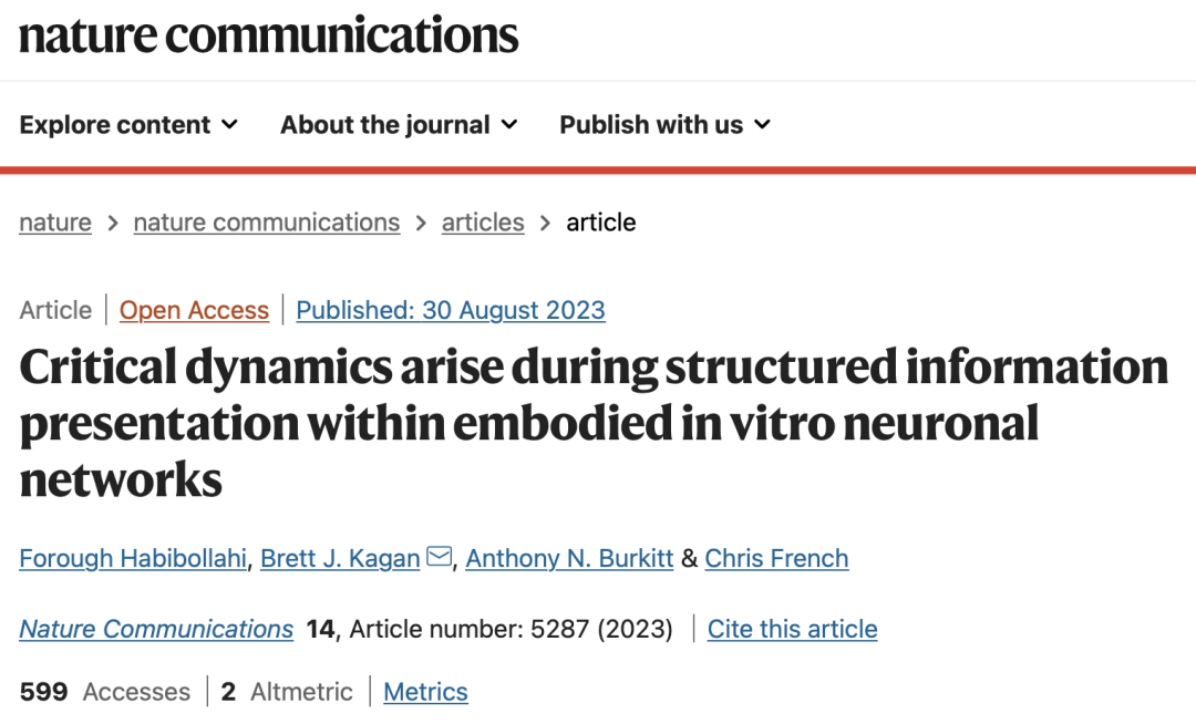 论文题目:Critical dynamics arise during structured information presentation within embodied in vitro neuronal networks期刊名称:Nature Communications斑图地址:https://pattern.swarma.org/paper/777d6fb2-4789-11ee-9e0a-0242ac17000d论文地址:https://www.nature.com/articles/s41467-023-41020-3