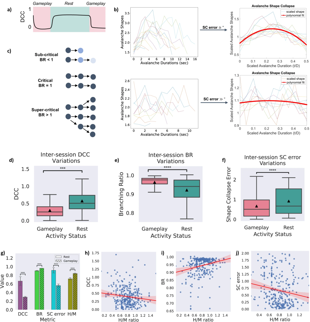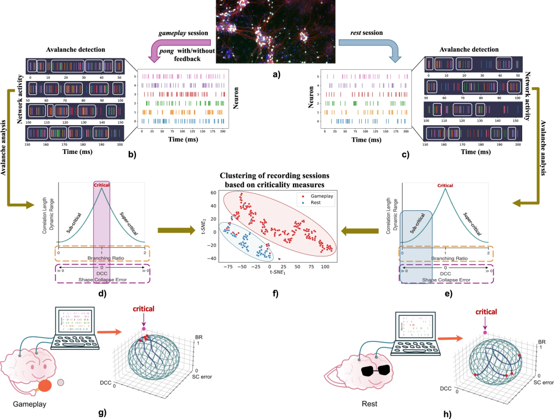 在这篇最近发表在 Nature Communications 上的文章中,作者使用皮质神经元构建了一个离体神经网络,利用DishBrain平台训练该神经网络玩一个简化的“Pong”游戏。具体来说,作者在多电极芯片上播种皮层神经元并记录其电生理活动,其中多电极芯片上的一组电极为感觉输入区域,另一组为运动输出区域。在感觉输入区域施加模式化的电刺激来模拟乒乓球的位置,并根据运动输出区域的活动电平控制模拟球拍的移动。当球拍打到或没打到球时,分别给予一定反馈。记录神经元在游戏过程中的活动变化,以及球拍的命中/失误比例(H/M ratio)等游戏表现,计算并比较在游戏过程中和静息状态下神经元的动力学性质。作者证明,当神经网络接收到与任务相关的结构化感觉输入时,会出现临界动力学特征,使系统到达近临界态(near-critical state),而在静息状态下则不能。并且游戏表现越好,系统越接近临界态。但是,临界态本身不足以使神经网络在没有反馈的情况下实现学习,封闭环路的反馈对于改进基于临界系统的游戏表现至关重要。这项研究有力地证明了,临界性是神经系统处理结构化输入信息的基本特征,无需高级认知功能的参与。图2:细胞在通过玩游戏接收结构化信息时,动力学特征会发生巨大变化。
