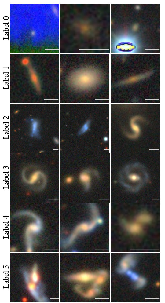 Label 0 结果中自左向右分别为伪迹、遮罩和低信噪比。Label 5 结果自左向右分别对应星系融合、引力透镜和尚未归类。