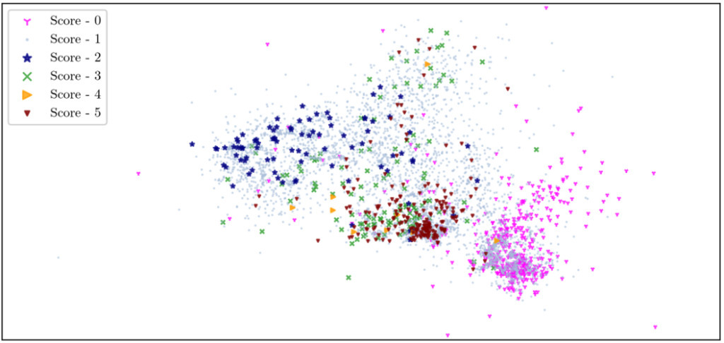 可以看到,0 分的伪迹和 5 分的异常现象在图中被分为紧密的团簇,说明两类图像都有很明显的特征。但同时,两类图像的分布很近,很容易让 iForest 算法产生误判。