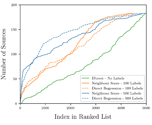 如图所示,iForest 算法发现的异常大多是伪迹。这些技术异常虽然也是异常,但没有什么科学价值。上述结果说明,NS 和 DR 算法可以帮助 Astronomaly 迅速排除伪迹的干扰,找到宇宙中的异常现象。