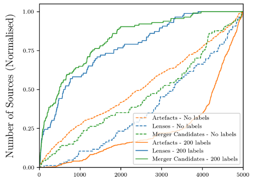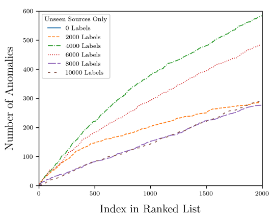然而,对数据集中 2,000 个数据进行标注后,Astronomaly 能够通过主动学习迅速找到图像中的异常。当标注数为 4,000 时,Astronomaly 新找到的异常现象最多,随后开始下降,说明此时不需要额外的标注,可以增大数据集。