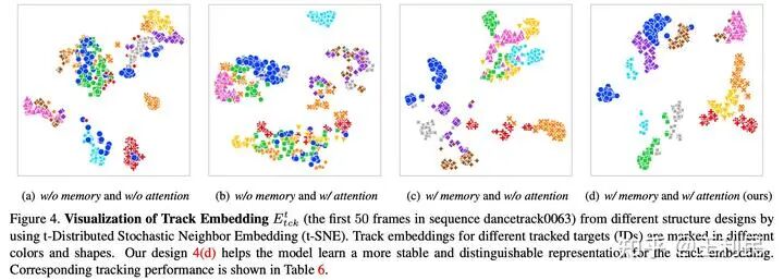 可以看到,当采用了 Memory Injection 之后(表中 ),跟踪指标都有了明显的提升;而如果进一步使用 Memory-Attention Layer(表中 attn),性能仍会有提升。为了解释这一结果,我们对这几种设定下的多帧 track embedding 向量进行了降维可视化如下,其中不同颜色和形状代表的散点代表来自不同目标(ID)的 track embedding: