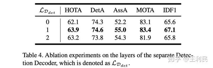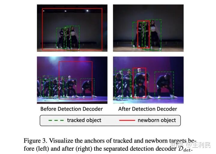 但是正如许多有关 DETR 的文章所讨论的,DETR 中的 detect query 扮演了一个类似于可学习 anchor 的角色,它往往不具备丰富的语义信息;但是 track query 是来自于上一帧的 DETR Decoder 的输出,其具有用于表示该目标的丰富语义信息。因此从直觉上来说,将这两者同时输入到一个模块中,由于两者的语义信息无法对齐,因此很可能引起冲突,从而对网络带来负面影响。