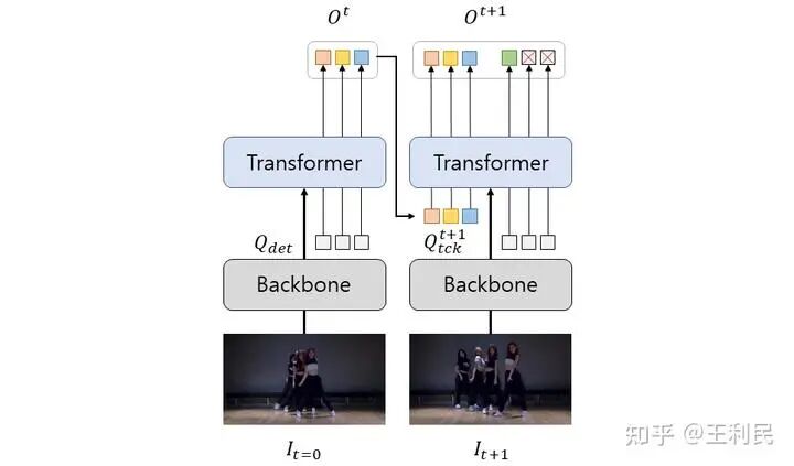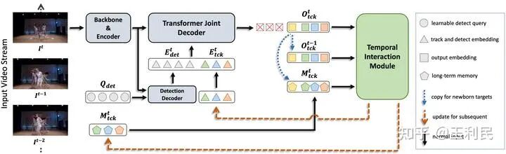 对于每一帧的处理可以视作一个独立的 DETR(图中 Transformer 部分)。对于视频第一帧, 由于不存在已经跟踪的目标, 因此仅仅输入可学习的 detect query , 对输出的内容通过分类阈值进行篮选,超过阈值的输出向量会被保留下来,记作 ; 而后经过一些后续处理(例如 MOTR 中的 QIM),转化成为输入到下一帧同样的 DETR 结构中的 track query, 记作 ; 随后, 将其和每一帧共用的 detect query 一起输入到 DETR Decoder 中进行逐层处理, 最终输出对应的向量:每一个 track query 所对应的目标自然继承来自上一帧的 ID 信息, 而 对应的目标再次经过阈值篮选,用于检测新生目标(newborn object),并且将其添加到已跟踪的目标列表中, 如此往复。