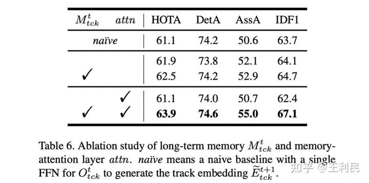 Memory Injection:对于每个目标经过 Memory-Attention Layer 之后输出的向量,我们通过j简单的加法向其中注入对应目标的长时记忆向量。由于在前述讨论中提到,长时记忆的更新是稳定平滑的,因此通过这一步骤可以使得后续的 track embedding 在时序上更加稳定,从而提升跟踪性能。