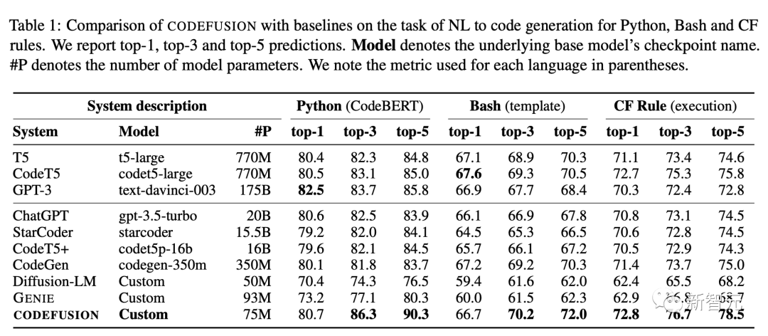 研究人员针对Bash、Python和Microsoft Excel条件格式(CF)规则的自然语言生成代码的任务来评估这个模型——CodeFusion。