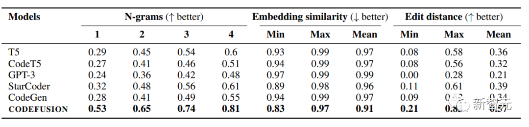 表下表展示了CODEFUSION和自回归模型(包括T5、CodeT5、StarCoder、CodeGen、GPT-3)在各项基准任务上的平均多样性结果,考察了每个模型的前5代生成结果。
