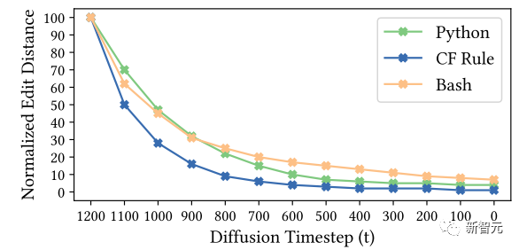 在消融实验中,作者停止了去噪过程,并生成了在时间步t∈[0, T]范围内的当前状态的代码片段。利用归一化字符串编辑距离来衡量每个时间步长(每100步为一个增量)所获得的结果。