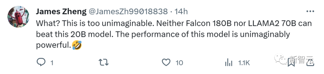 「这也太难以想象了!Falcon-180B和Llama2-70B,竟然都无法击败这款20B的模型。」