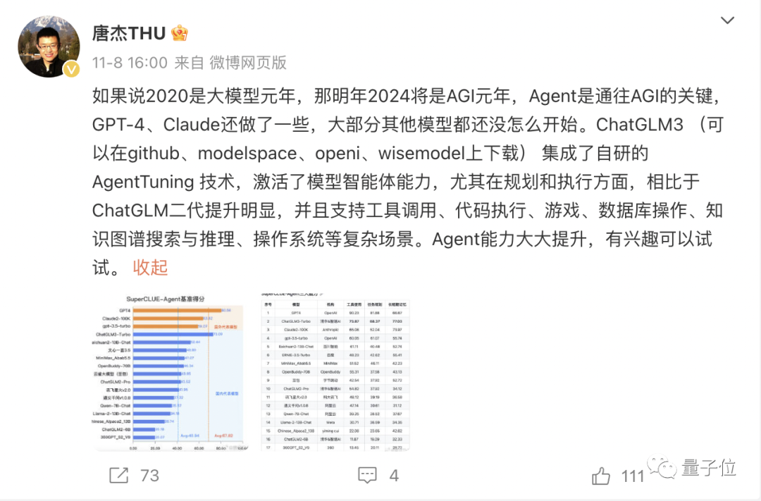 基座模型迭代后,公司创始成员、清华计算机系教授唐杰在其微博中称,明年将是“AGI元年”。