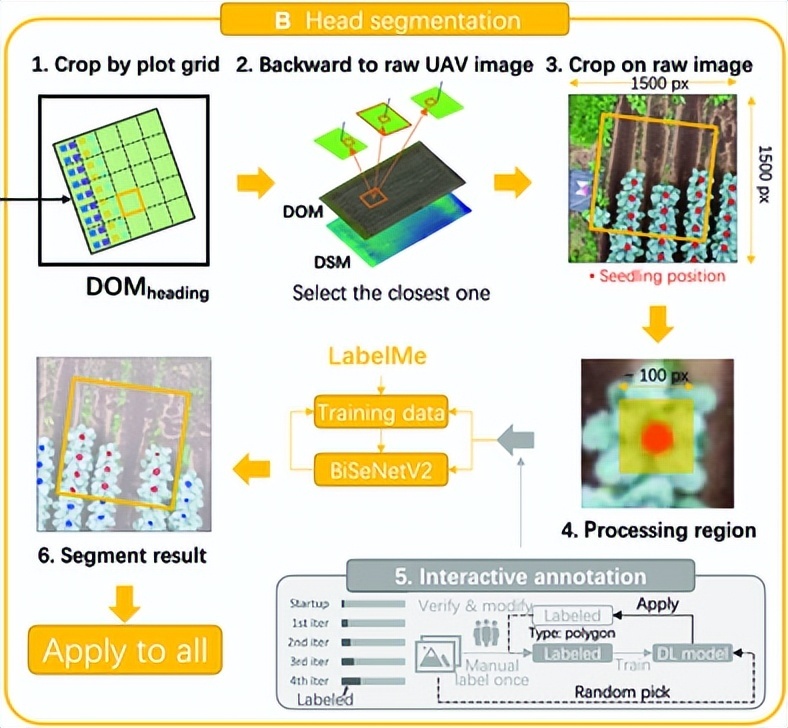 在实验过程中,为减轻深度学习数据标注和处理的工作负担,消除部分土壤和杂草的影响,研究人员以时间序列数据融合为指导,缩小了处理区域,仅使用幼苗周围的正方形区域(约 100 × 100 像素,略大于西兰花头)进行西兰花头分割。