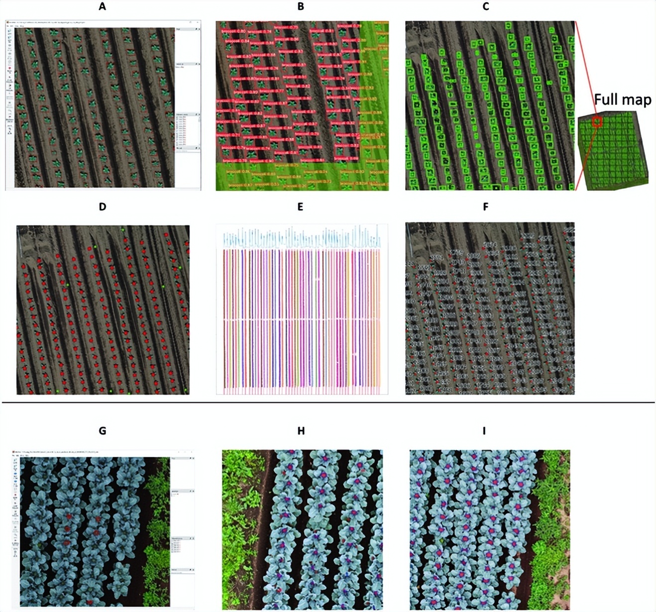 然后,将边界框的中心点视为西兰花的位置,在开源地理信息系统 Quantum GIS 中手动检查、调整检测结果,确保没有遗漏或重复的检测。