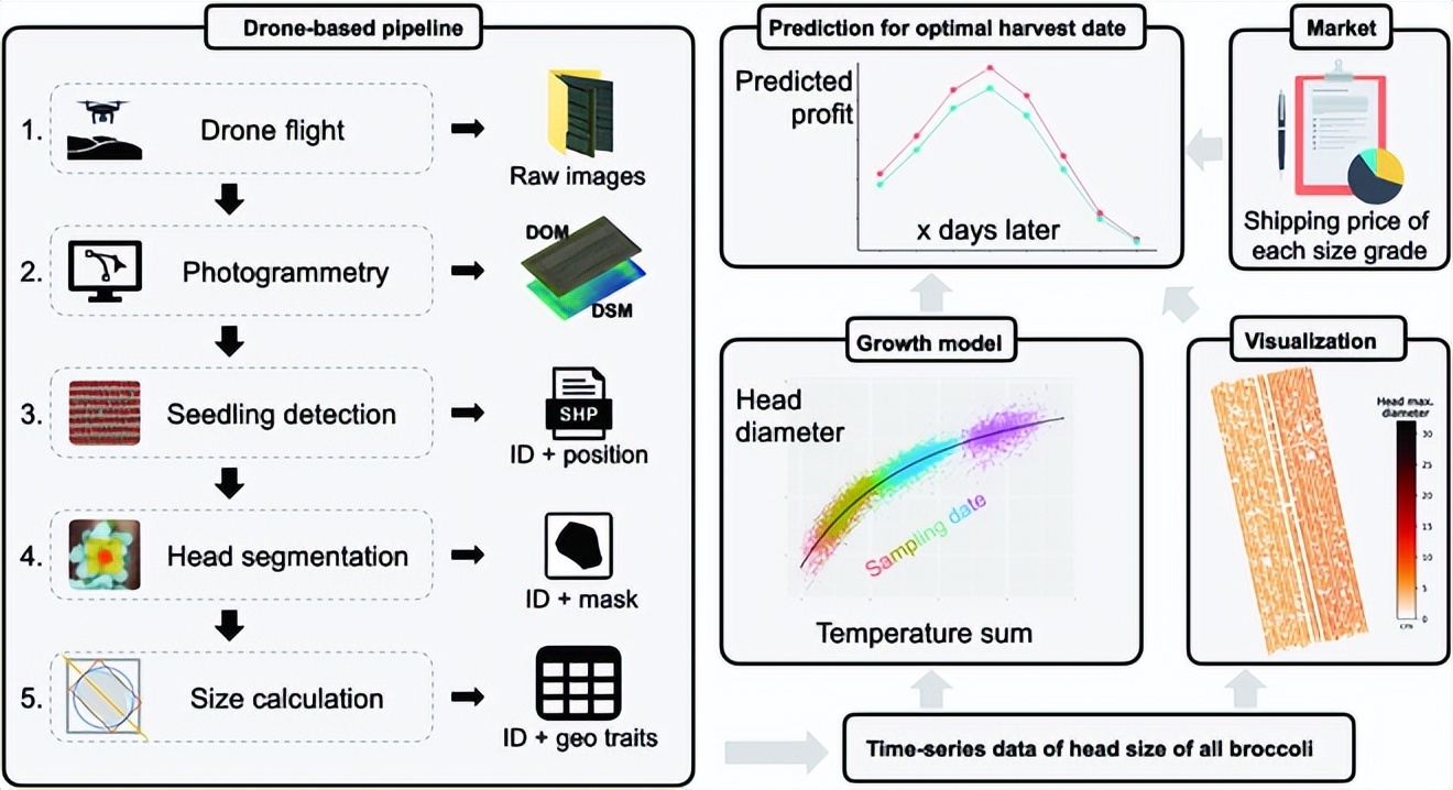 随着无人机飞向田间地头,人们也开始探索基于无人机航拍图像数据,预测最佳采收日期。来自东京大学和千叶大学的研究人员开发了一套利用无人机采集植物表型数据的系统化流程,基于无人机遥感和图像分析,预测每个西兰花头的大小,并将数据输入基于温度的生长模型中,从而预测最佳的采收日期。