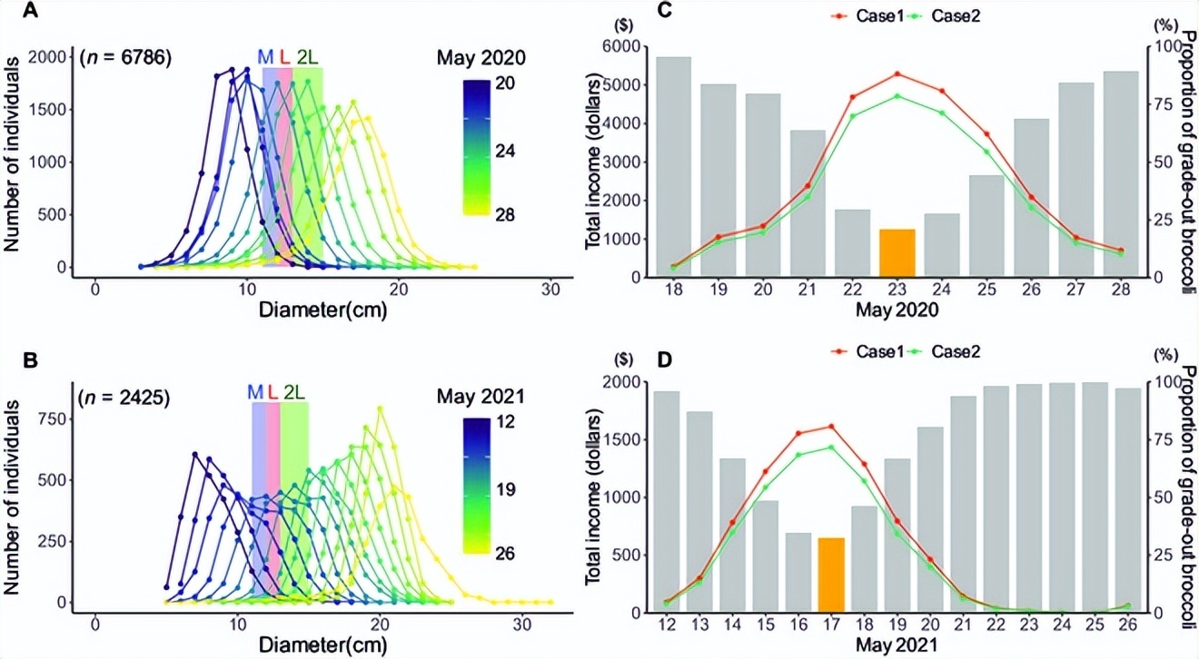 在 2020 年的实验中,5 月 23 日是最佳收获日期,即非标准尺寸西兰花比例最小化、总收入最大化的日期。在 2021 年的试验中,5 月 17 日被确定为最佳收获日期。