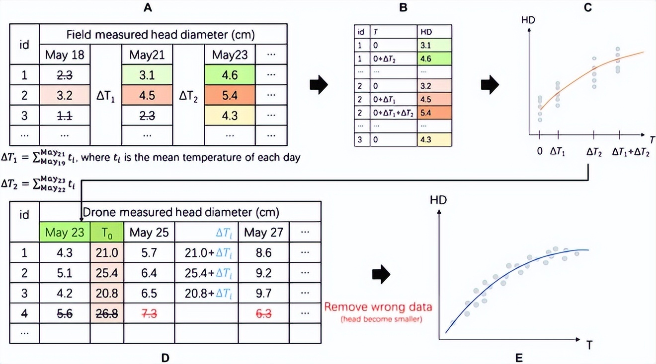 如下图所示,为了获取首次飞行的归一化温度 T(0) (HD 约为9.5厘米),研究人员将先前的模型反转以从 HD 数据中计算 T(0)。然后计算后续天数 (i) 的每日温度和 (Ti),最后对该模型进行回归计算。