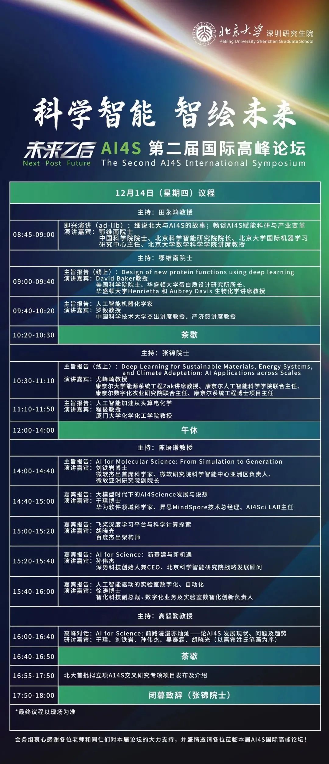 2023年12月14日,北京大学深圳研究生院会议中心作为将“AI”与“科研”深度融合的新兴科技形态,AI4S(人工智能驱动的科学研究,亦称作科学智能)通过利用AI技术学习、模拟、预测和优化自然界及人类社会的各种现象和规律,以期解决各类科学问题,推动科学发现与研究创新,因而被称为“科学研究第五范式”。其有助于建立和完善科学技术体系,提高技术储备和创新能力,促进行业应用与产业发展,为产业基础升级和产业链现代化注入新血脉。2023年12月14日,“未来之后”AI4S第二届国际高峰论坛由北京大学深圳研究生院发起,作为建院22周年“南燕园·新起点·新征程”系列活动之一,论坛将以“科学智能,智绘未来”为主题,以鄂维南院士的即兴演讲——细说北大与AI4S的故事&倾谈AI4S赋能科研与产业变革为重磅起笔,旨在集聚前沿科学思想、促进科技产业孕育发展,引入“AI强引擎”,助力“科学加速跑”,形成战略科技力量发展合力,为构建科技引领产业的融合共进新模式提供不竭的源头动力。AI4S如何助力建立和完善科学技术体系,提高技术储备和创新能力?如何促进AI4S的行业应用与产业发展,为产业基础升级和产业链现代化注入新动力?面对上述问题,本次高峰论坛将紧贴AI4S发展脉搏、高位链接全球创新学术资源,邀请华盛顿大学生物化学讲席教授David Baker教授、中国科学技术大学杰出讲席教授罗毅教授等高校学者介绍国内外学术专家对深度学习模型和相关AI4S工具方面所做的努力,分享AI4S促进跨学科合作的看法;微软杰出首席科学家刘铁岩博士、华为软件领域科学家于璠博士等企业专家讲述产业界目前对AI4S在气象、生物、化学等领域的先进应用案例;深势科技创始人兼CEO孙伟杰等产业精英分享大模型时代下AI4S的发展,AI4S业务给行业带来的新启发和新机遇,探讨人工智能科学研究的未来。前路漫漫亦灿灿,AI4S与S4AI对点亮科技创新(全面创新)有着无限可能。报告结束后,论坛将邀请刘铁岩、胡晓光、于璠、孙伟杰、吴泰霖一众学者专家展开高峰对话,探讨AI4S的发展现状、问题,展望AI4S的发展趋势。论坛当天也将发布并介绍北大首批拟立项AI4S交叉研究专项项目,进一步迈开AI4S探索的脚步,在与会人员的见证下展现未来北大在AI4S领域的深远布局。本届论坛将于2023年12月14日上午8:45准时启幕,届时论坛将在南方都市报,深圳特区报,北京大学微信视频号等平台展开直播。诚邀您扫描下方报名二维码或直播二维码,与我们开启人工智能与科学前沿创新之旅,共话AI4S研究领域的变革发展!本期来源:南燕科研 公众号