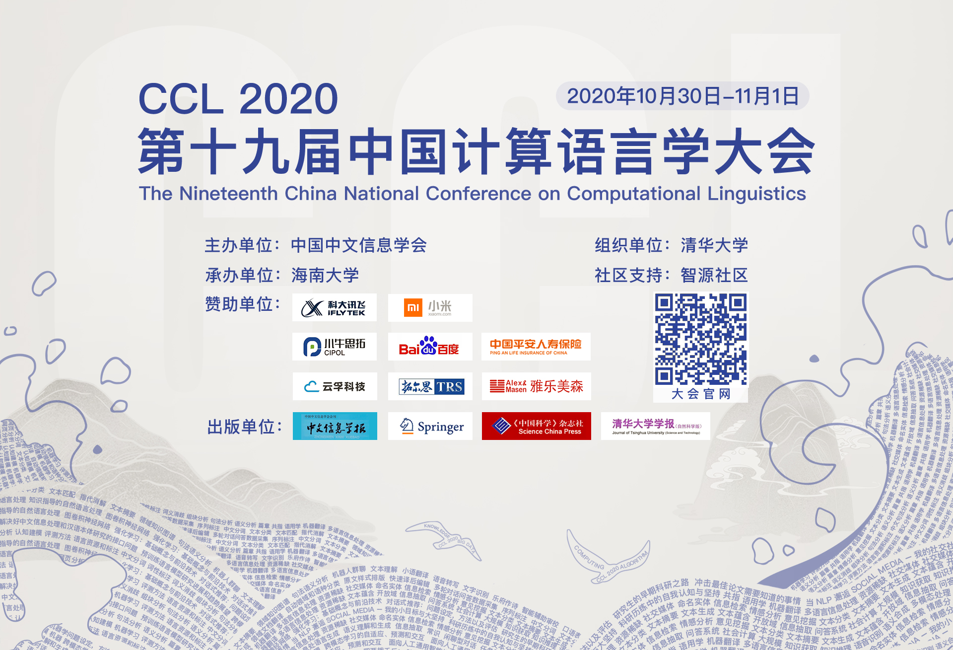 “第十九届中国计算语言学大会” 第十九届中国计算语言学大会(The Nineteenth China National Conference on Computational Linguistics, CCL 2020) 将于2020年10月30日—11月1日在海口举行。会议主办单位为中国中文信息学会,承办单位为海南大学。CCL是中国中文信息学会(CIPSC)的重要会议,是中国最大的自然语言处理学者和专家的社区。经过二十多年的发展,CCL被广泛认为是最权威的,全国最具影响力、规模最大的NLP会议。随着计算机语言处理在中国的发展,CCL已经成为在全国范围内传播计算语言新学术和技术工作的主要论坛。CCL 2020线上举办,免注册,通过视频直播对外开放。