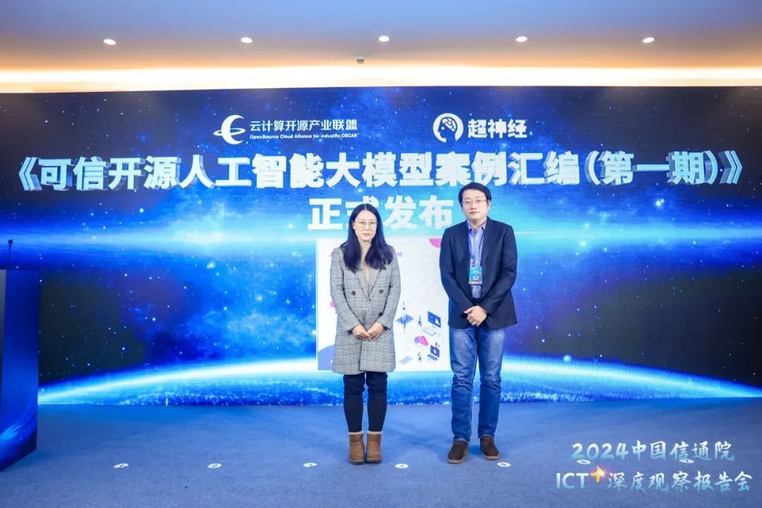 在 12 月 21 日 2024 中国信通院 ICT 深度观察报告会上,HyperAI超神经创始人王臣汉和中国信通院云大所开源和软件安全部主任郭雪携手宣布,「可信开源大模型案例汇编(第一期)」案例正式发布。