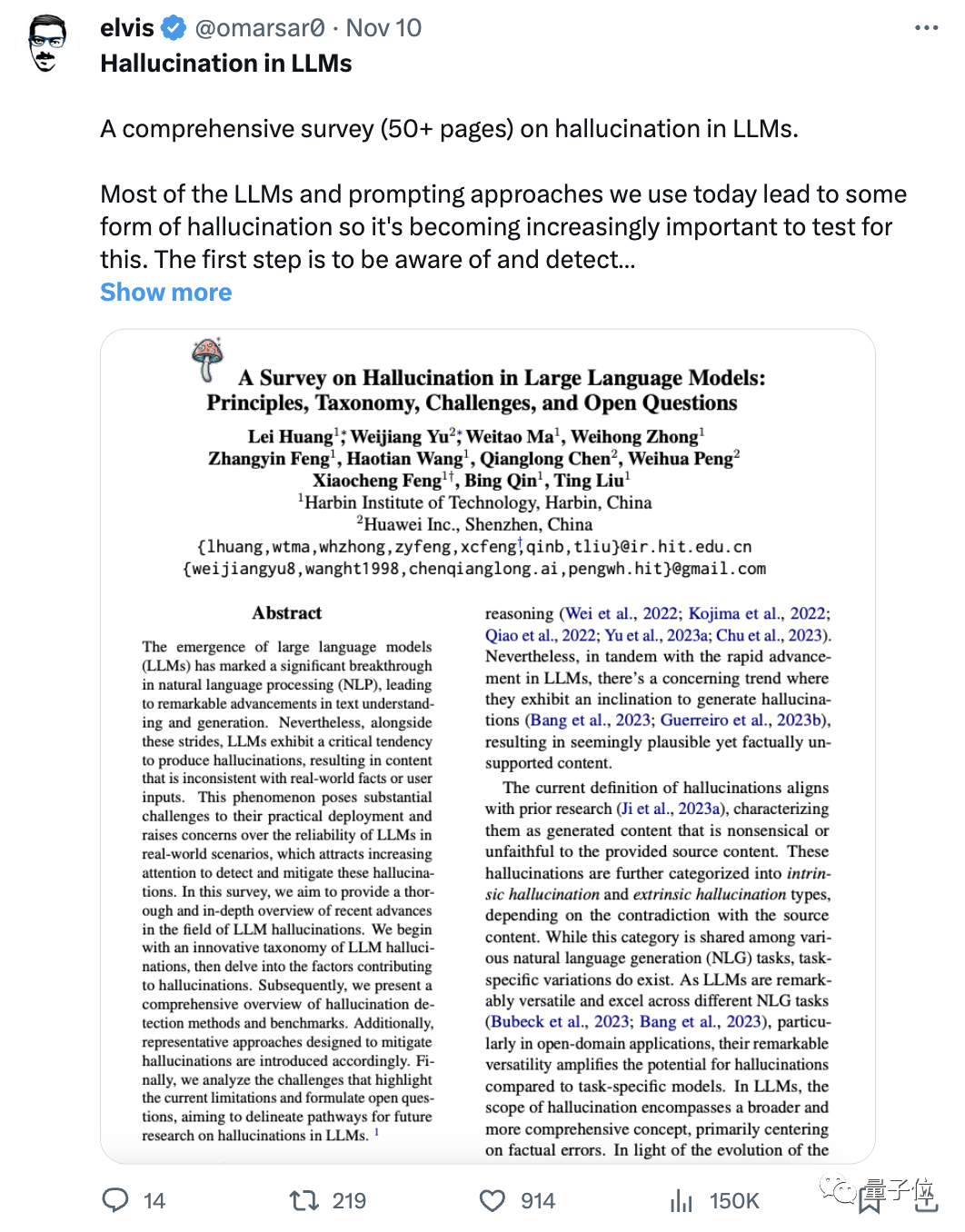 由于这一缺陷太过引人担忧,今年关于AI幻觉的研究非常火热,哈工大华为联合发表的一篇大模型幻觉综述,曾在网上爆火。