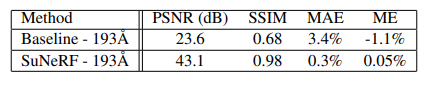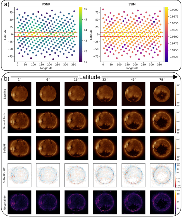 质量评估:图 (a) 展示了模拟中每个视点的峰值信噪比 (PSNR) 和结构相似性 (SSIM)。SuNeRFs 提供了高质量的结果,最小 SSIM 为 0.97。接近黄道面的点显示最小误差,而随着纬度增加,误差逐渐增加,符合训练-测试拆分的预期。