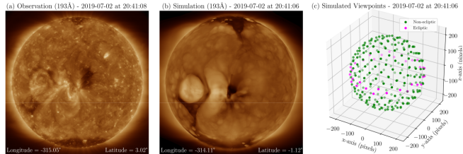 研究人员采用预测科学公司 (PSI, Predictive Science Inc) 对太阳日冕的磁流体动力学 (MHD, magneto hydrodynamic) 模拟,估计太阳大气中等离子体参数和磁场的全球三维分布。选取 256 张从均匀间隔的观测点拍摄的 193 年太阳的前向模型图像,其中黄道上的 32 个观测点作为训练集,黄道以外纬度的观测点作为测试集。