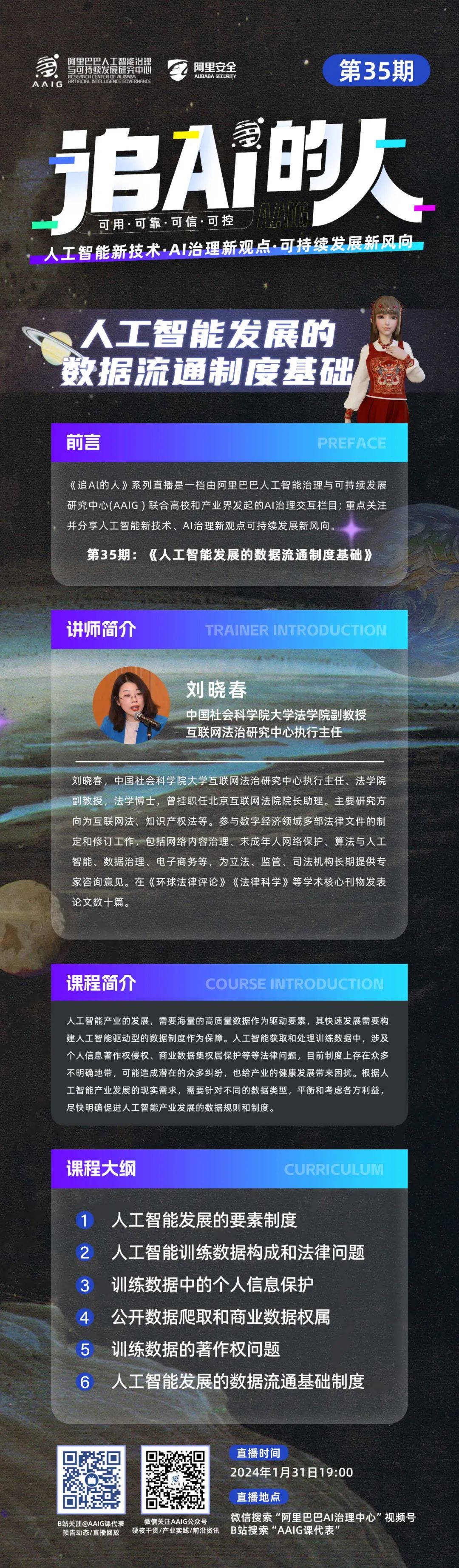 今晚(1月31日)19:00,《追AI的人》系列直播第35期邀请了中国社会科学院大学互联网法治研究中心执行主任刘晓春分享《人工智能发展的数据流通制度基础》。