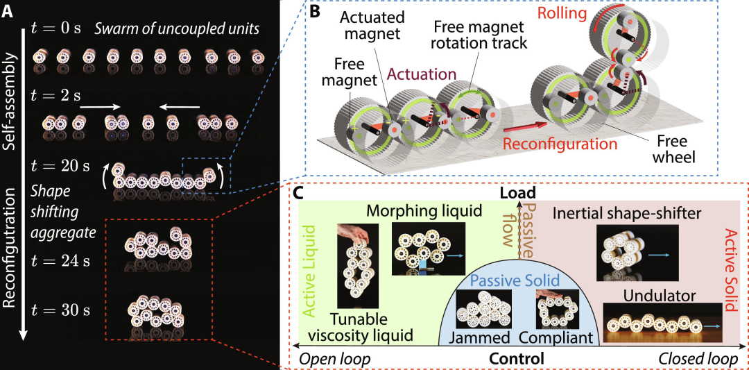 设计能够改变自身物理形态和柔顺性以适应环境约束的机器人系统,仍然是一个重大的概念和技术挑战。为了解决这个问题,这项发表于 Science Robotics 的最新研究介绍了一种模块化系统 Granulobot,它模糊了软体、模块化和群体机器人之间的区别。该系统由类似齿轮的单元组成,每个单元包含一个执行器,使得单元可以通过磁耦合自组装成更大的模块化聚合体。这些聚合体可以动态重新配置,也可以分裂成子系统之后再重新组合。聚合体可以自组织成具有固态和液态特性的集体状态,从而显示出广泛不同的柔顺性。这些状态可以通过执行器被局部地扰动,或者通过环境的机械反馈被外部扰动,以一种分散式方式产生自适应的形状变化。这反过来可以产生适应不同条件的运动策略。聚合体可以越过障碍物,而无需使用外部传感器或坐标在不同的表面上保持平稳步态,单元之间也无需进行电子通信。模块化设计突出了一种物理、形态上的控制形式,推动了具有形态变化和适应不同功能和条件能力的弹性机器人系统的发展。图1. 模块化系统 Granulobot 连接软体机器人和活性颗粒材料