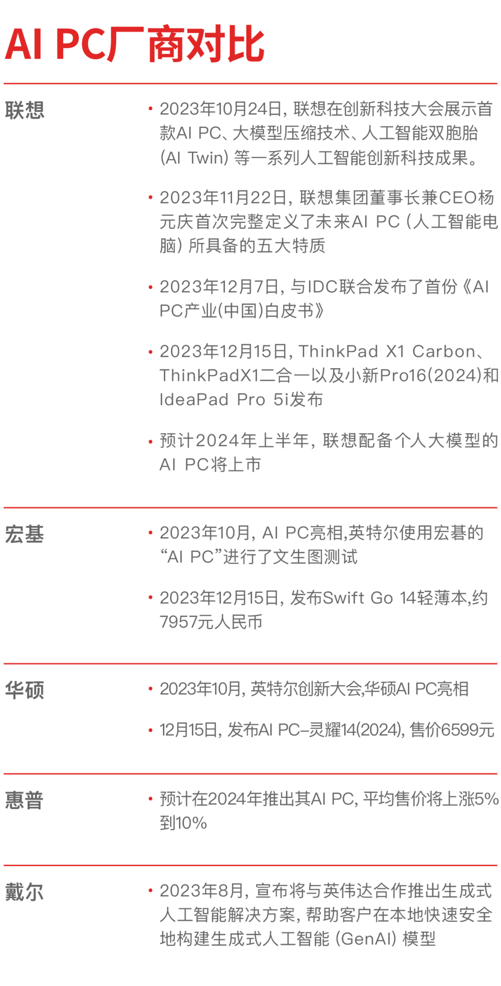 为了争夺AI PC的大旗争当“领跑者”,PC厂商们的动作普遍并不算慢。以下是虎嗅整理的市面上主要PC厂商,今年以来披露的关于AIPC主要战略和动作: