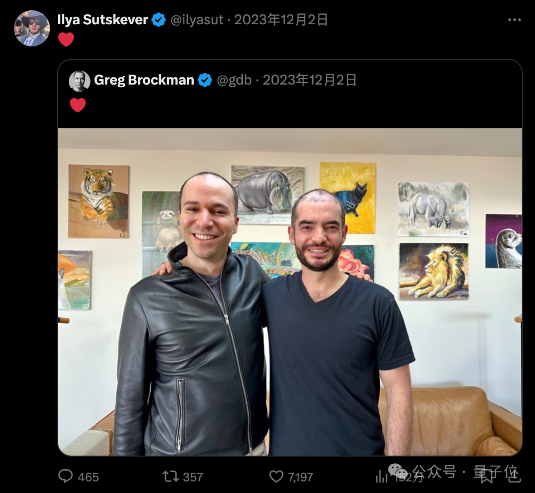 由OpenAI总裁Greg Brockman晒出两人合照,Ilya回以一个红心。