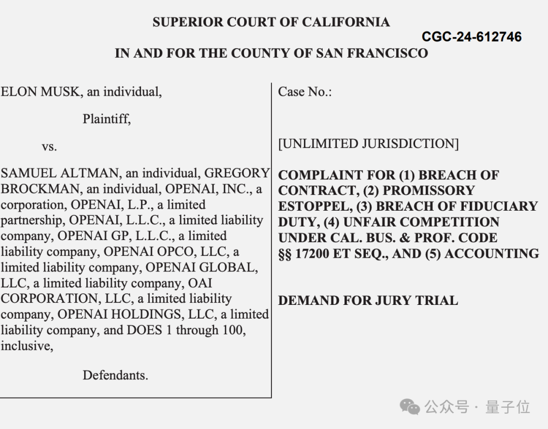 起诉书:https://www.courthousenews.com/wp-content/uploads/2024/02/musk-v-altman-openai-complaint-sf.pdf