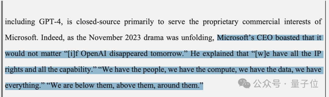 起诉书中却记录了OpenAI董事会宫斗期间,微软CEO纳德拉曾“夸耀”过,不在乎OpenAI是否明天就消失。