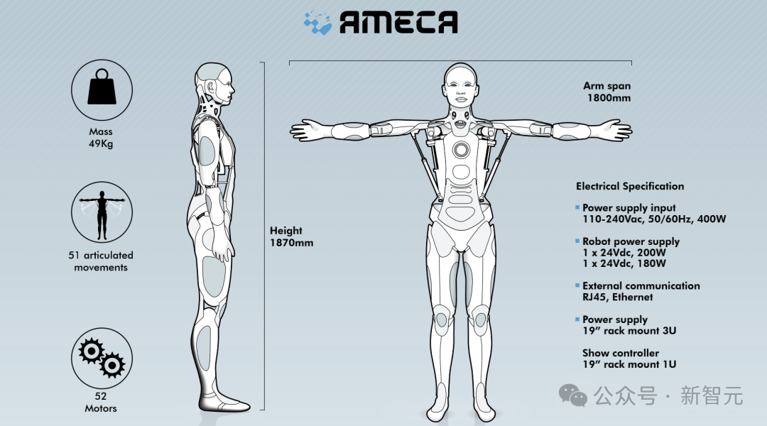 据介绍,Ameca重49kg,1.87m,身体共有52个模块,支持51种关节运动。