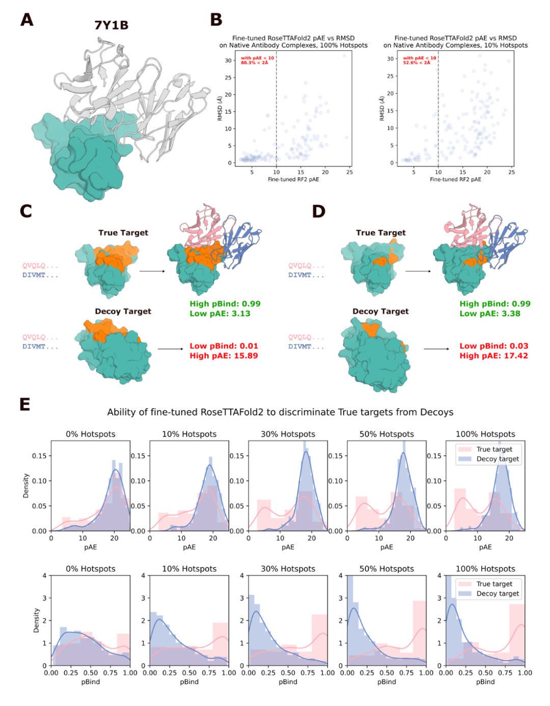 RoseTTAFold2 网络则主要用于预测抗体结构,特别是在抗体-抗原复合物中的抗体结构。它能够帮助验证设计的抗体结构与抗原的结合模式是否符合预期。基于 Transformer 神经网络架构,RoseTTAFold2 网络使用大量的蛋白质结构数据进行训练。它通过对蛋白质序列进行序列到序列的预测,从而得到全新的蛋白质 3D 结构。图|经过微调的 RoseTTAFold2 能够区分真正的复合物和诱饵复合物。(来源:该论文)
