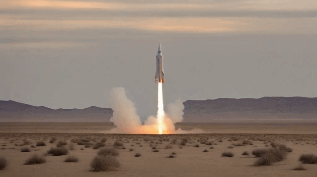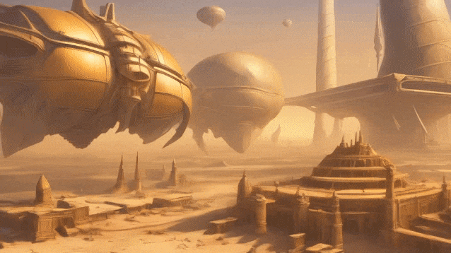 In the middle of a vast desert, a golden desert city appears on the horizon, its architecture a blend of ancient Egyptian and futuristic elements.The city is surrounded by a radiant energy barrier, while in the air, seve