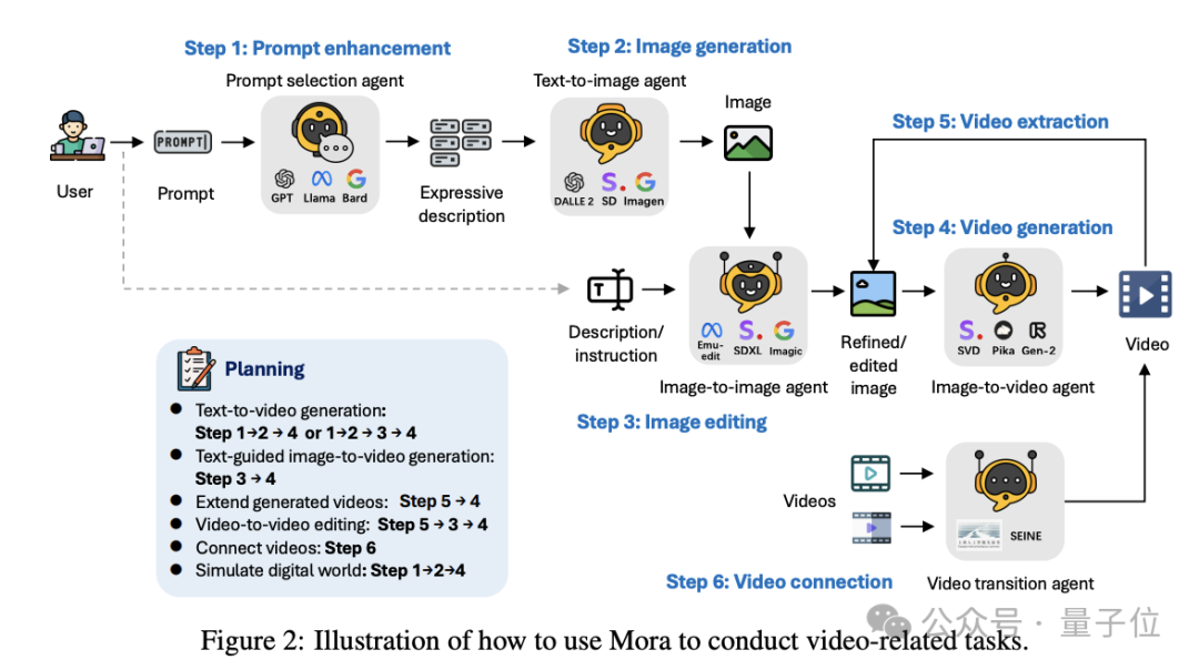 他们认为解决不同视频生成任务,需要不同专业能力agent协作。为此,Mora框架中有5个基本角色组成: