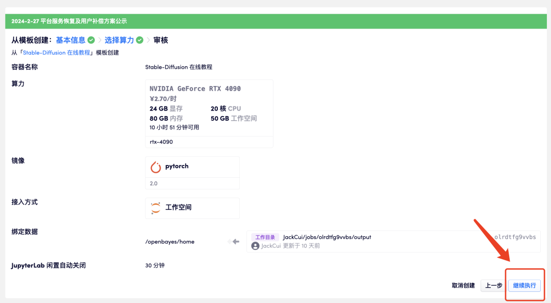 3. 点击「审核并执行」-「继续执行」。推荐使用 RTX 4090,新用户使用下方邀请链接注册,即可获得 4 小时 RTX 4090 + 5 小时 CPU 的免费算力时长!