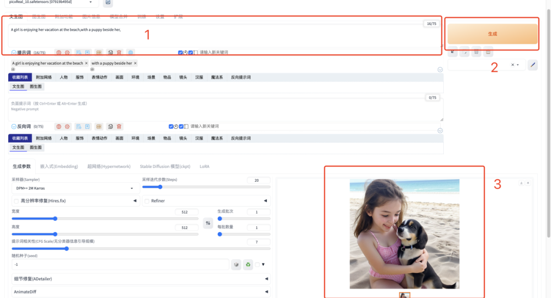 2. 如果想要生成视频,需要在输入英文提示词后,选择 AnimateDiff 插件,将生成帧数填写为 32 帧,其余参数默认,稍等片刻,即可生成动图或者视频啦。