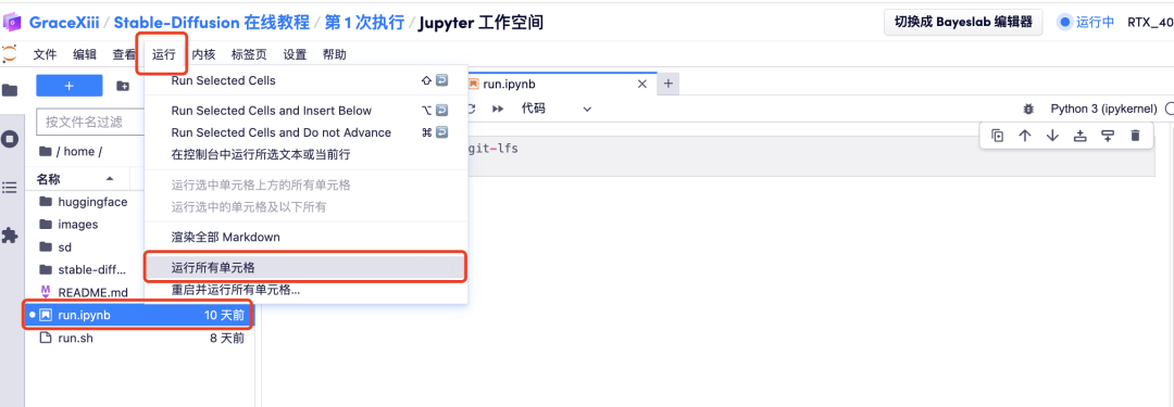 5. 打开工作区后,点击左侧的 「run.ipynb」,然后通过菜单栏上的 「运行 」按钮点击 「运行所有单元格」。