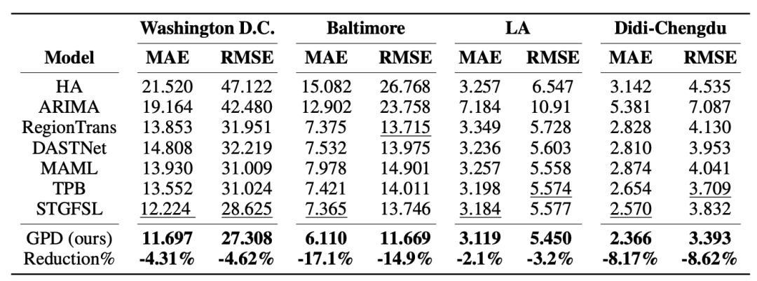 在华盛顿特区、巴尔的摩、洛杉矶和成都数据集中,与上表中划线标记的最佳基线方法相比,GPD 的平均误绝对差 (MAE) 分别降低了 4.31%、17.1%、2.1% 和 8.17%。这表明,GPD 在不同数据场景下一致表现优越,实现了有效的神经网络参数层面的知识迁移。