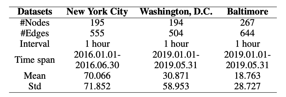在人群流动预测中,研究人员在 3 个真实世界数据集上进行了实验,包括纽约市、华盛顿特区和巴尔的摩。每个数据集包含所有区域的每小时城市人流量。
