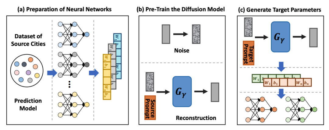 其优势在于,通过预训练一个扩散模型,从源城市的数据中学习到有关优化神经网络参数的知识,然后根据提示生成适应目标城市的神经网络。