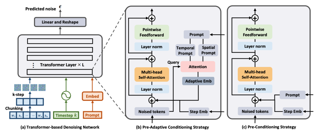 在去噪过程中,除了噪声序列外,Transformer 扩散模型还考虑了时间步长 k 和区域提示 p。研究人员探索了多种调节方法,例如后适应调节、自适应规范调节,对 Transformer 层设计进行了微小但重要的修改,调整策略如上图 (b) 和 (c) 所示。