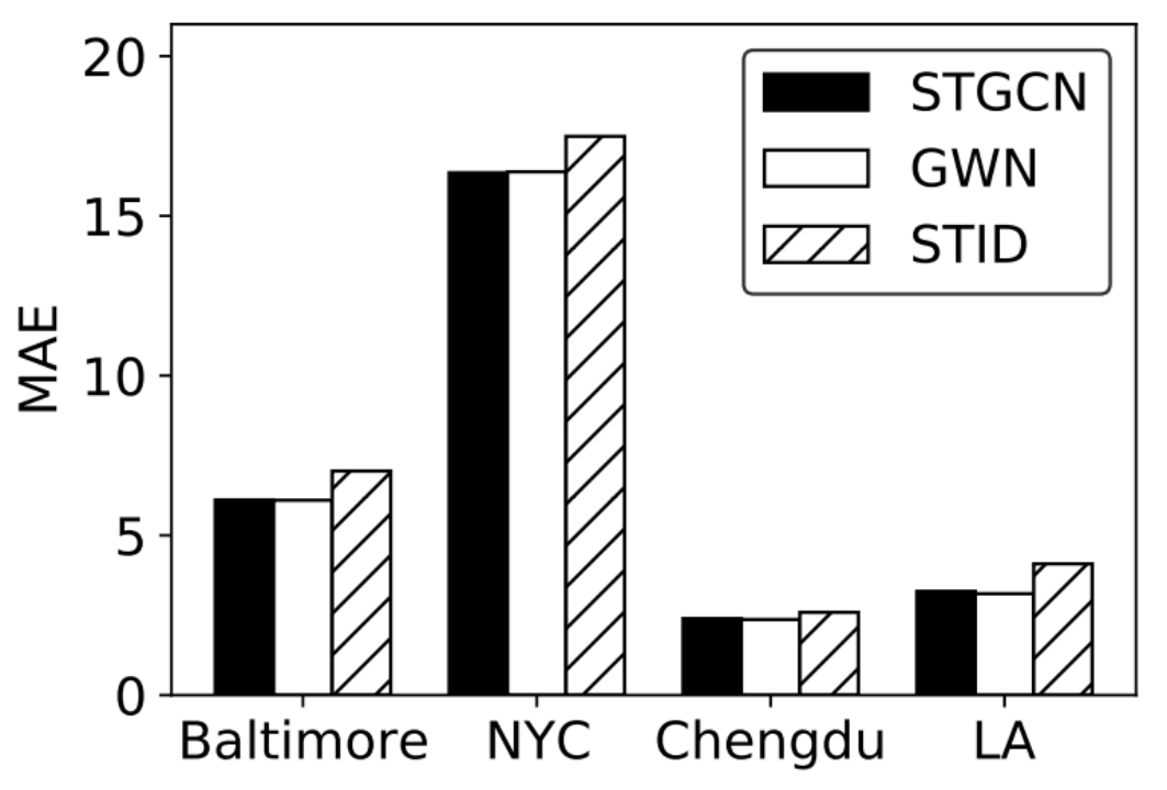 此外,该研究还验证了 GPD 框架对于不同时空预测模型适配的灵活性。除了经典的时空图方法 STGCN 外,该研究还引入了 GWN 和 STID 作为时空预测模型,并使用扩散模型生成其网络参数。实验结果表明,框架的优越性不会受到模型选择的影响,因此可以适配各种先进的模型。