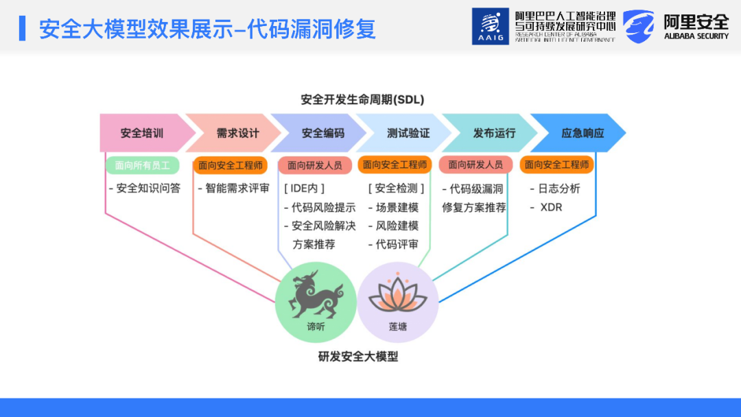 通过上面这个案例,我们可以展示出我们希望大模型在舆情分析中能够实现的目标。例如,对于淘宝平台来说,大模型的任务是识别哪些信息是值得平台关注的。例如,在微博上出现了一条信息,内容涉及官方媒体报道某些纹身贴可能含有致癌物质的警告。对于这类信息,需要通过模型捕捉并评估,确认平台是否有商家在售卖相关的纹身贴产品,并据此采取相应的措施。模型在这个过程中起到关键的作用,帮助平台快速响应可能存在的舆情风险,确保用户保护和品牌声誉的维护。在设计我们的模型时,我们设定了模型输出的内容结构,在这个结构设计中,我们希望模型首先能够总结出信息的标题,然后摘要概括出内容的要点,并给出判别理由。在这个特定案例中,输出的重点是因为这是官方媒体所发布的消息,并且涉及到商品品质风险,因此非常有必要引起我们平台的重视。同时,模型还需要提供指令,指导商品评估部门密切关注此信息,并实时与相关商户沟通。在阿里巴巴安全团队中,我们对内部集团的代码进行安全评估。不同部门提交的代码需要在我们这里经过安全审查,只有在评估认为没有潜在风险之后,这些代码才被允许发布。在这一套流程中,我们希望能让大模型参与进来,负责识别风险和漏洞。此外,利用大模型的生成能力,在决定存在漏洞且具有风险时,模型能够生成推荐代码,辅助研发人员进行代码修复。